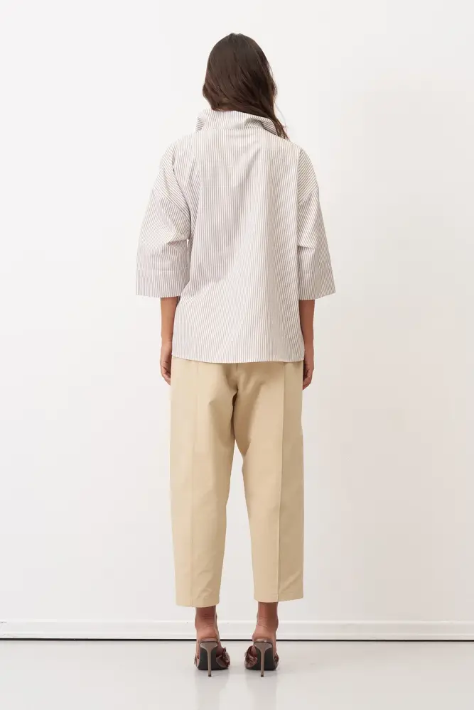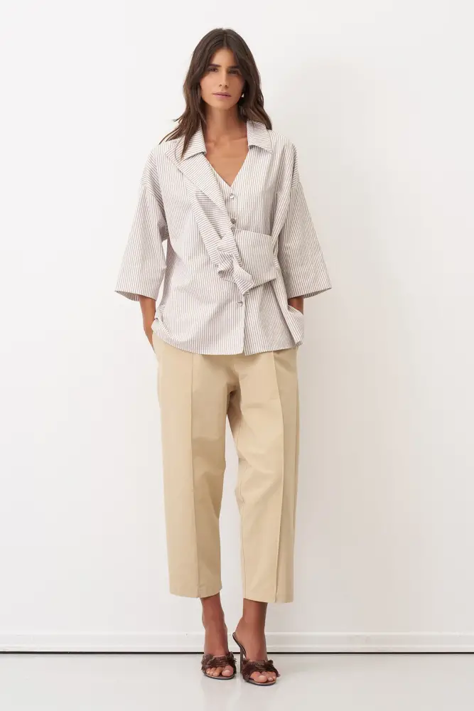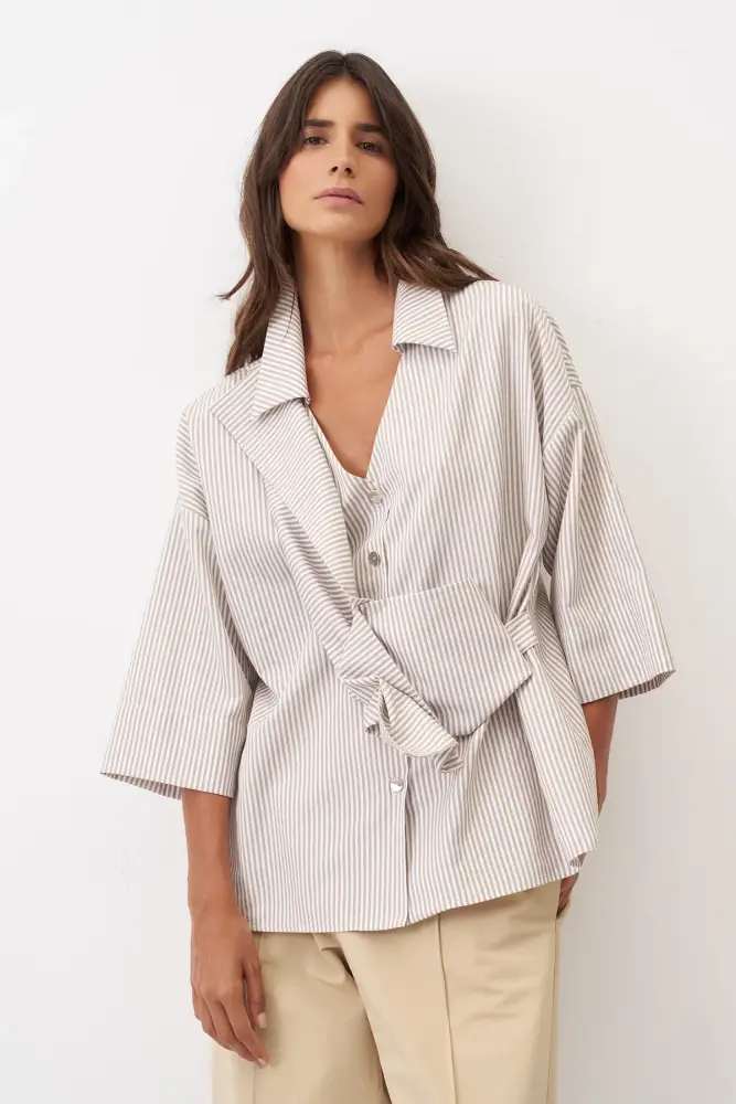 Bej Katlamalı Kuşaklı Çizgili Manolia Gömlek