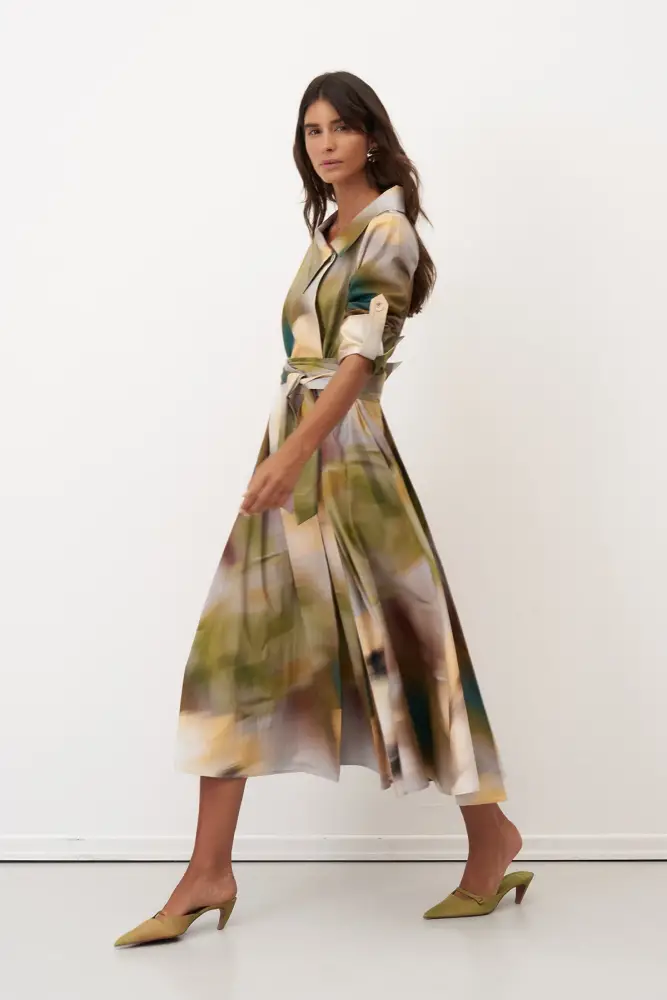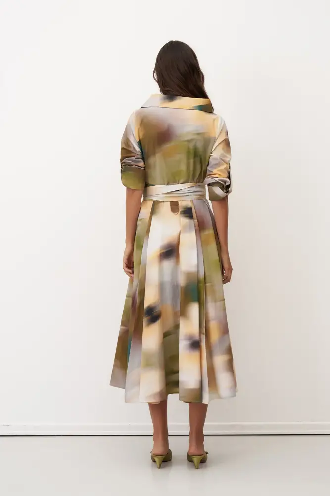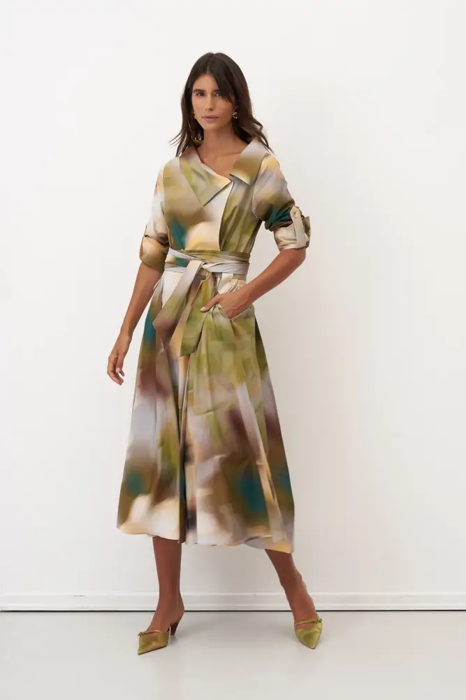 Yeşil Beli Kemerli Düğmeli Kastraki Gömlek Elbise