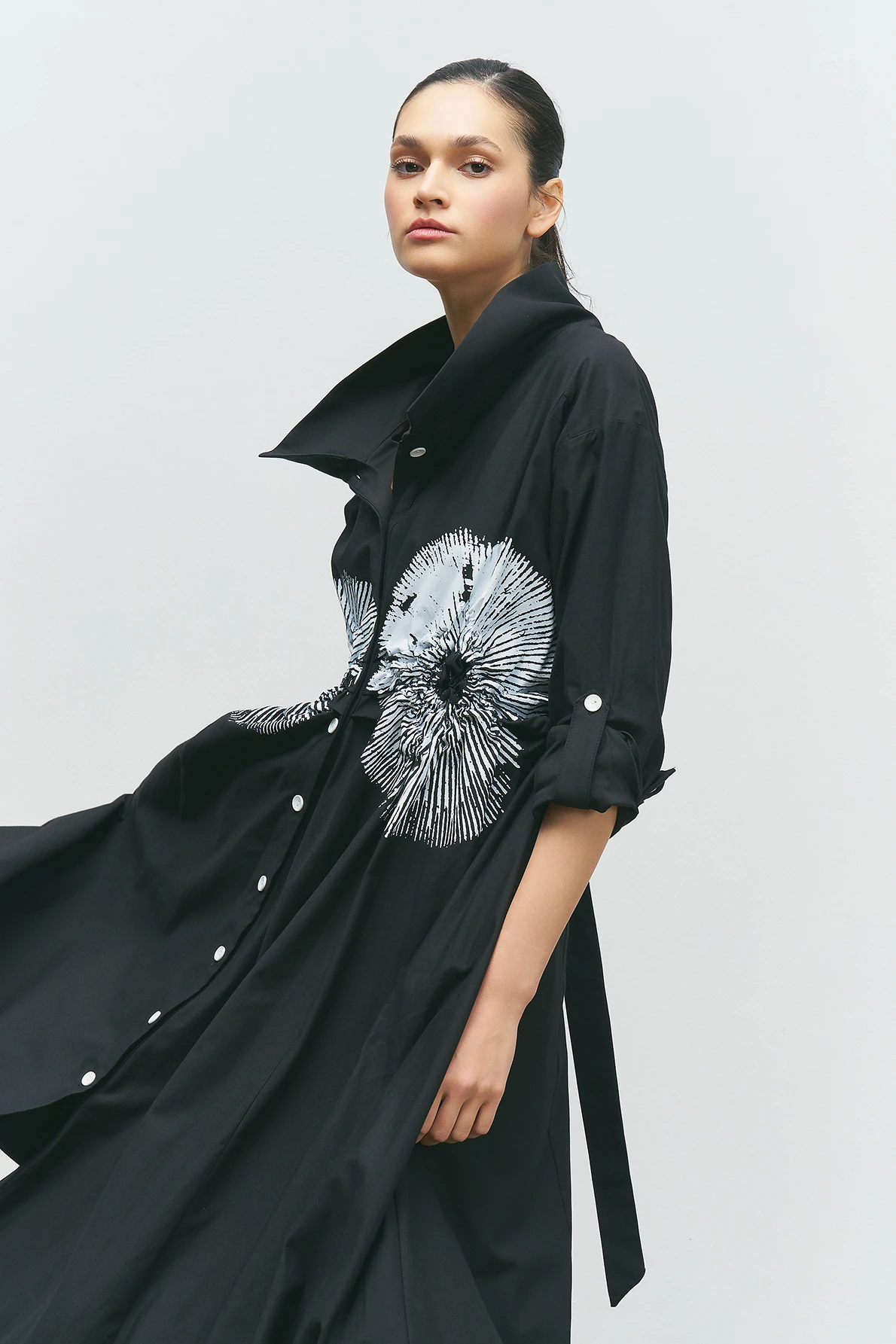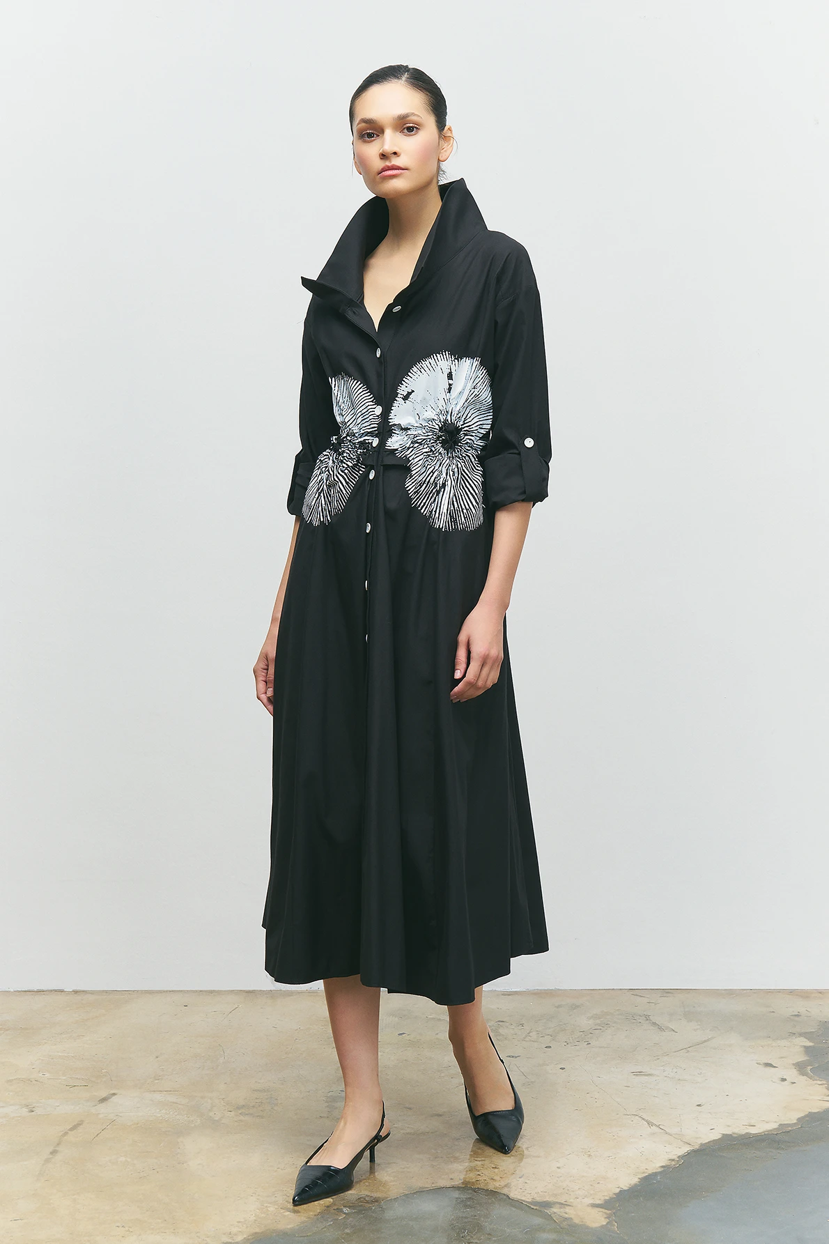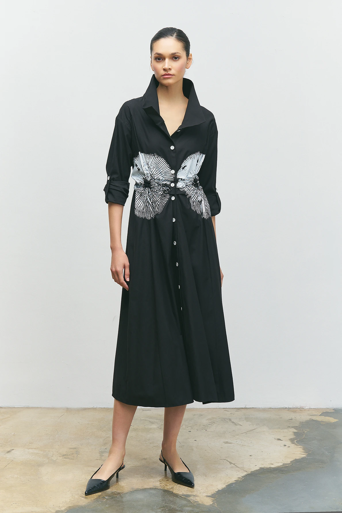 Önü Düğmeli Baskılı Elbise - Siyah