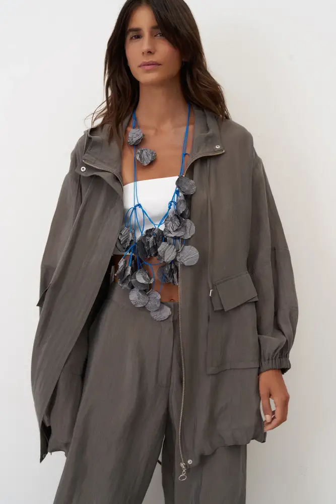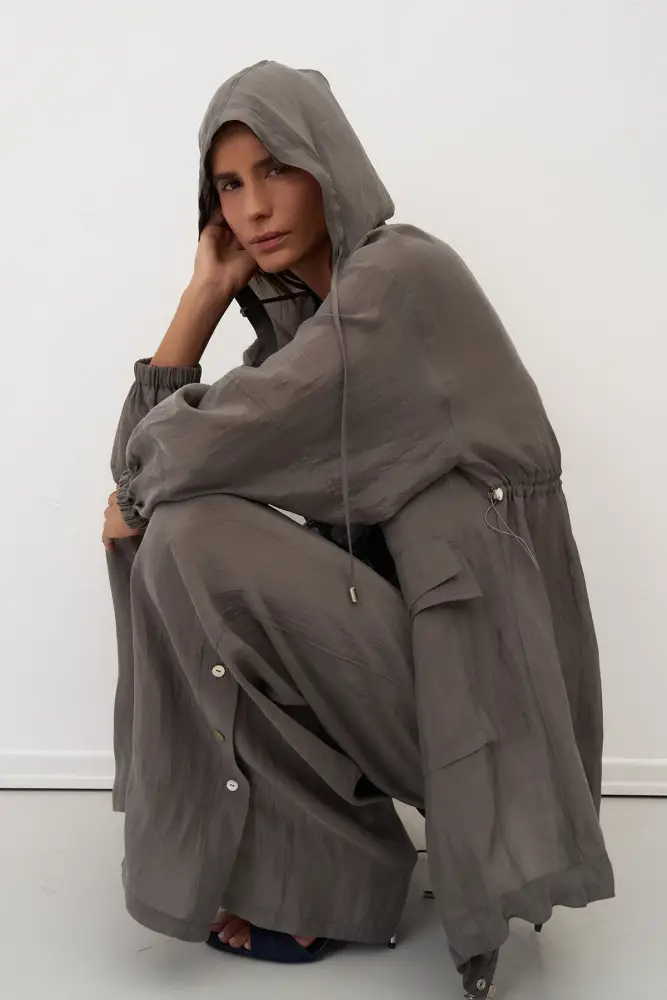 Gri Kapüşonlu Fermuarlı Büyük Cepli Mykonos Ceket