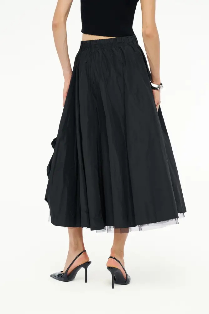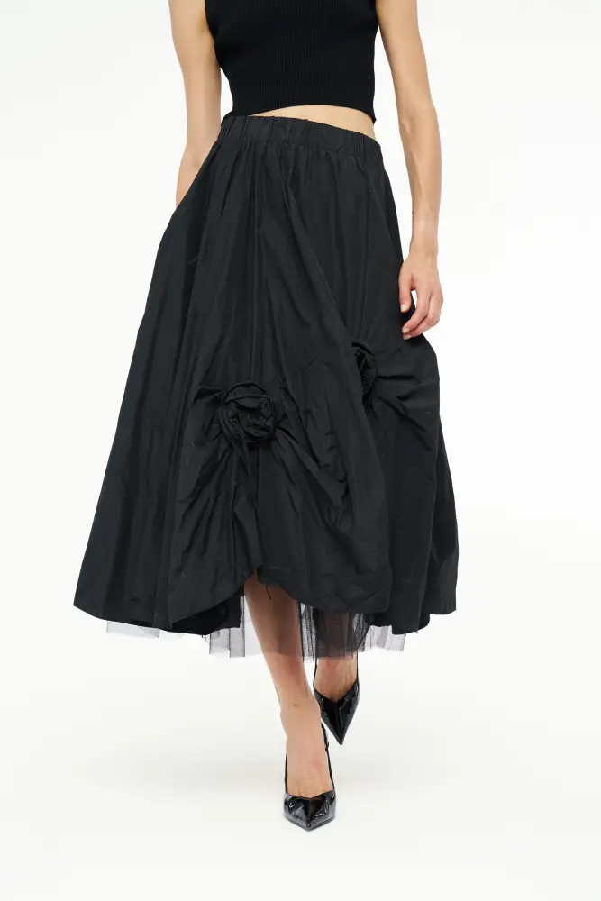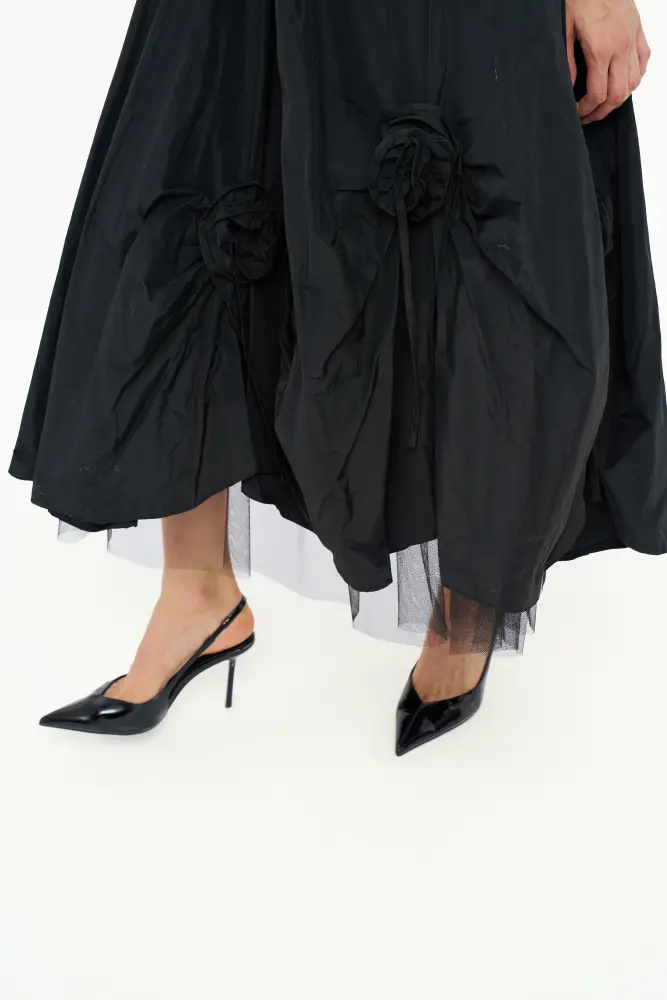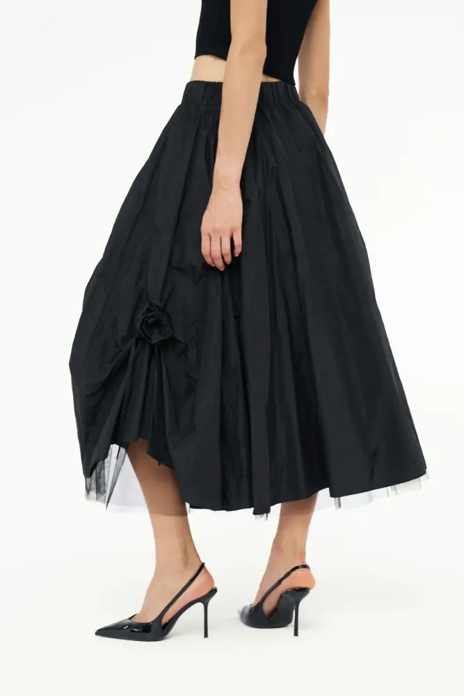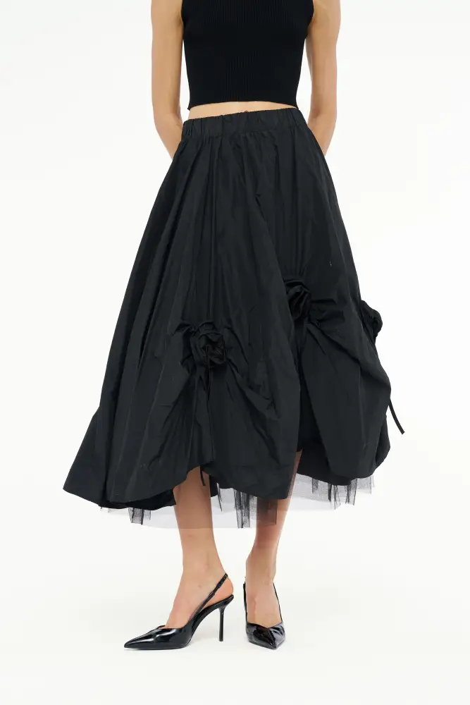 Gül Motifli Tafta Etek - Siyah