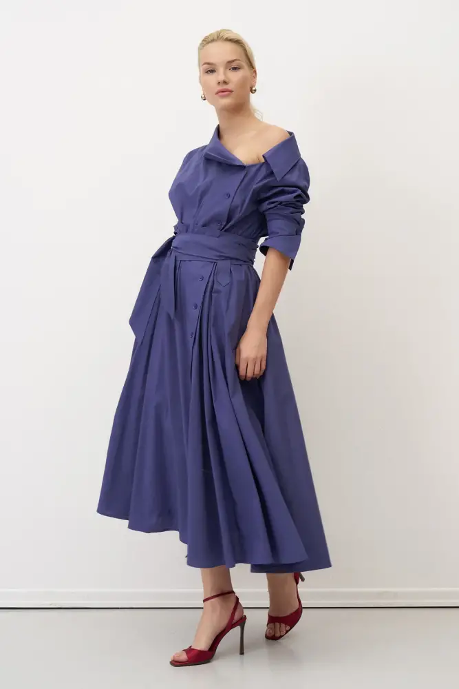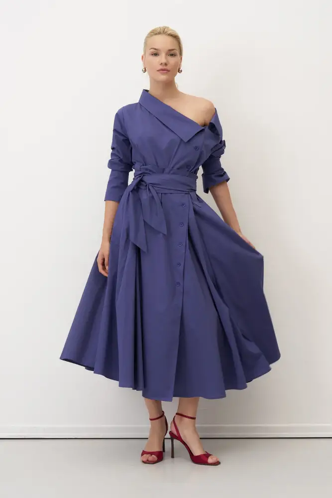 İndigo Asimetrik Yaka Beli Kemerli Telendos Elbise