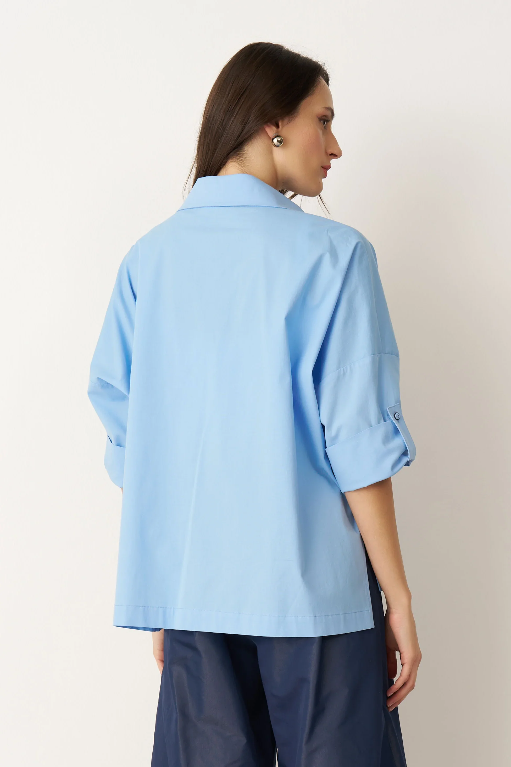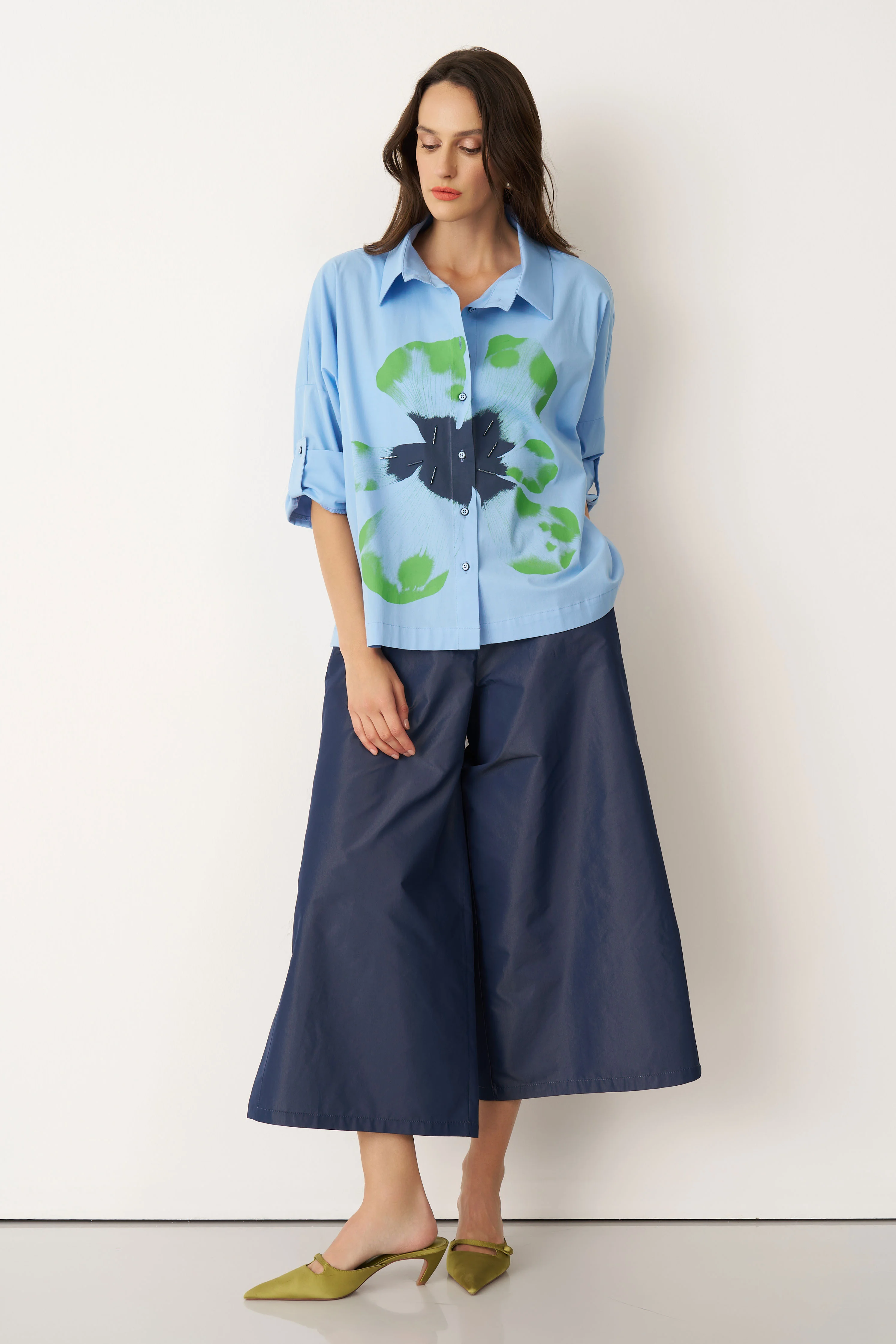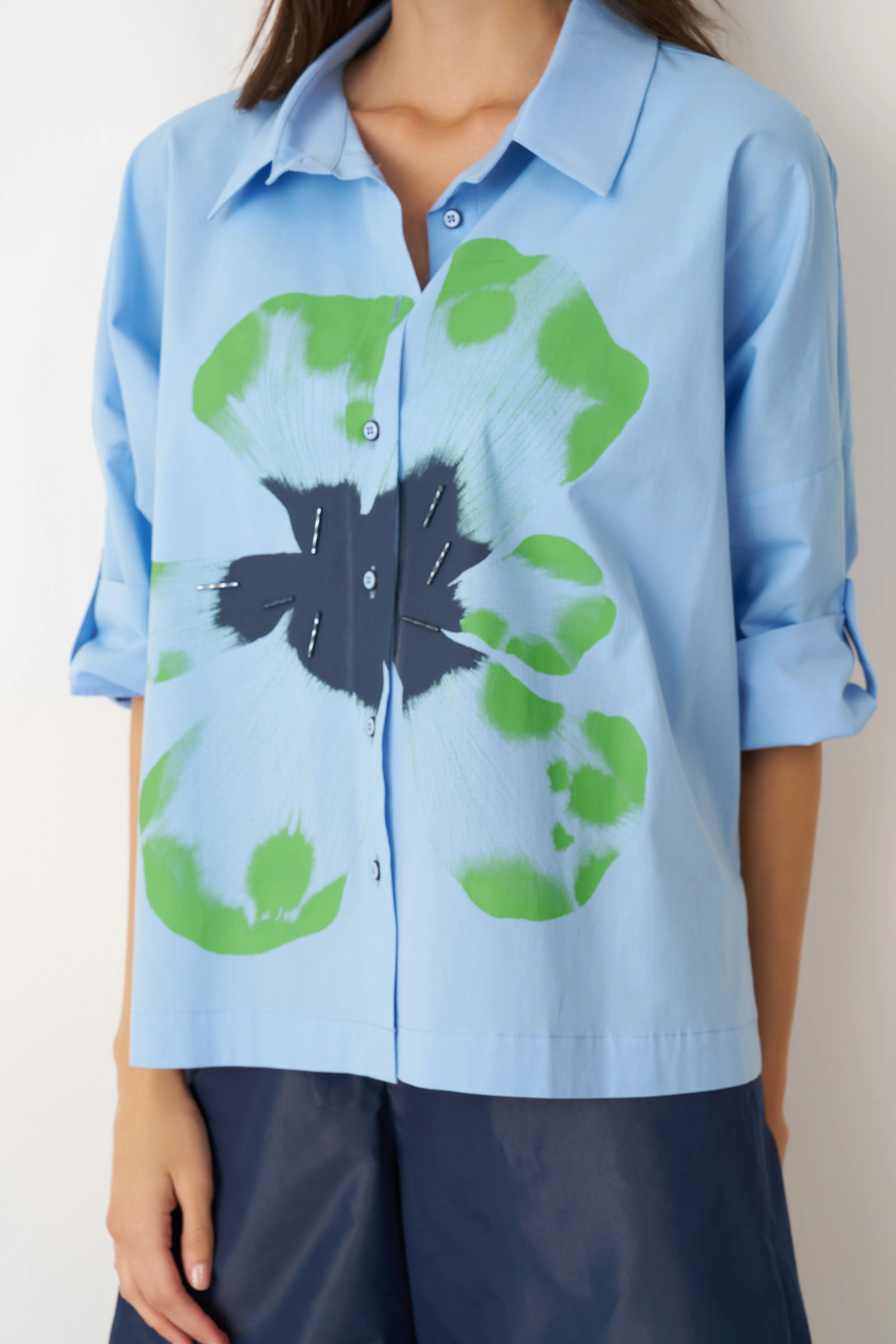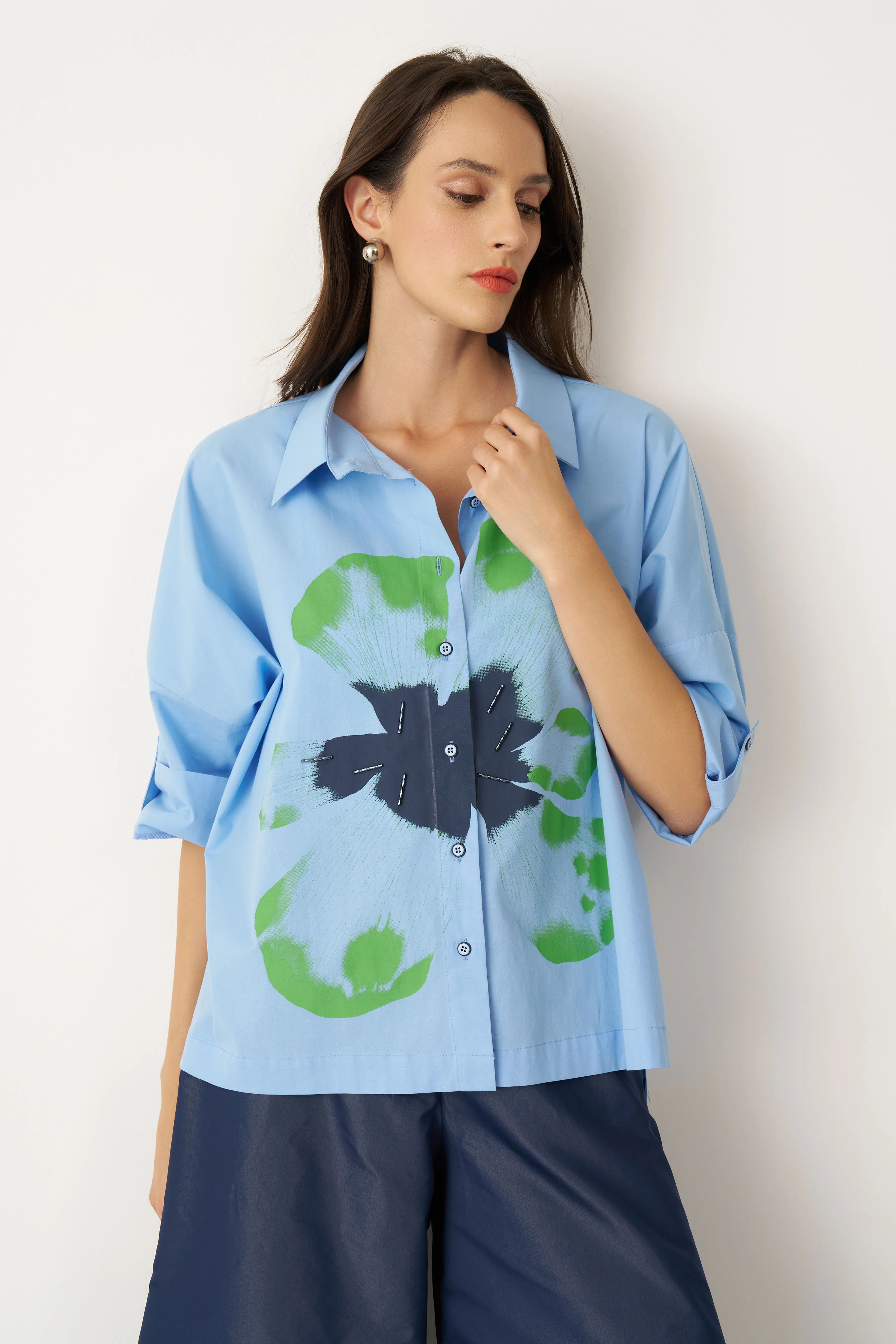 Mavi Önü Büyük Çiçek Baskılı Gavdos Gömlek