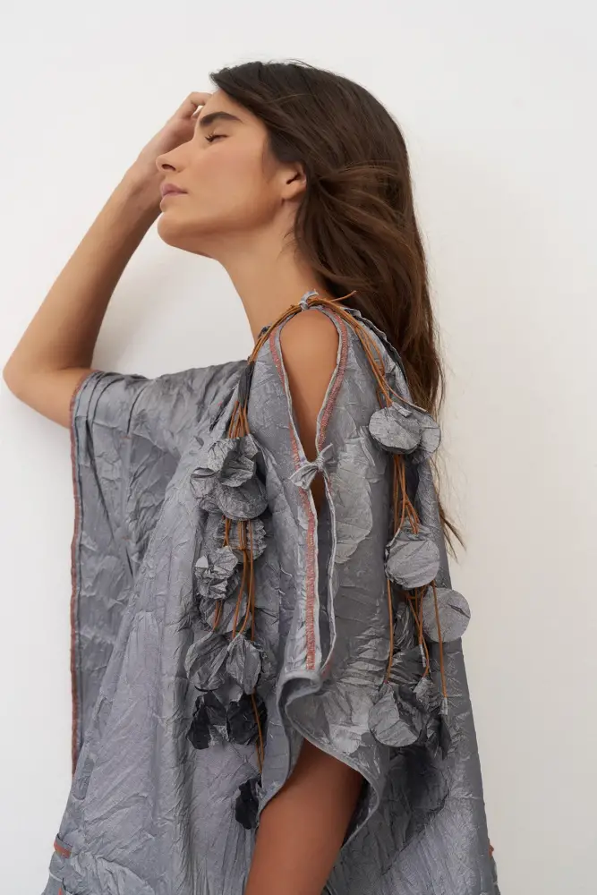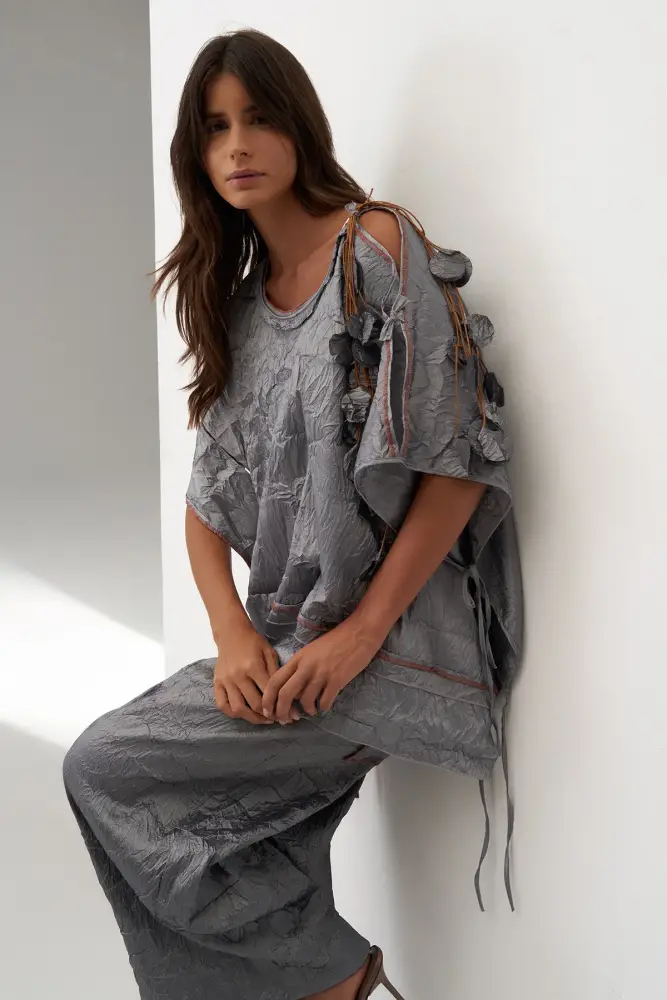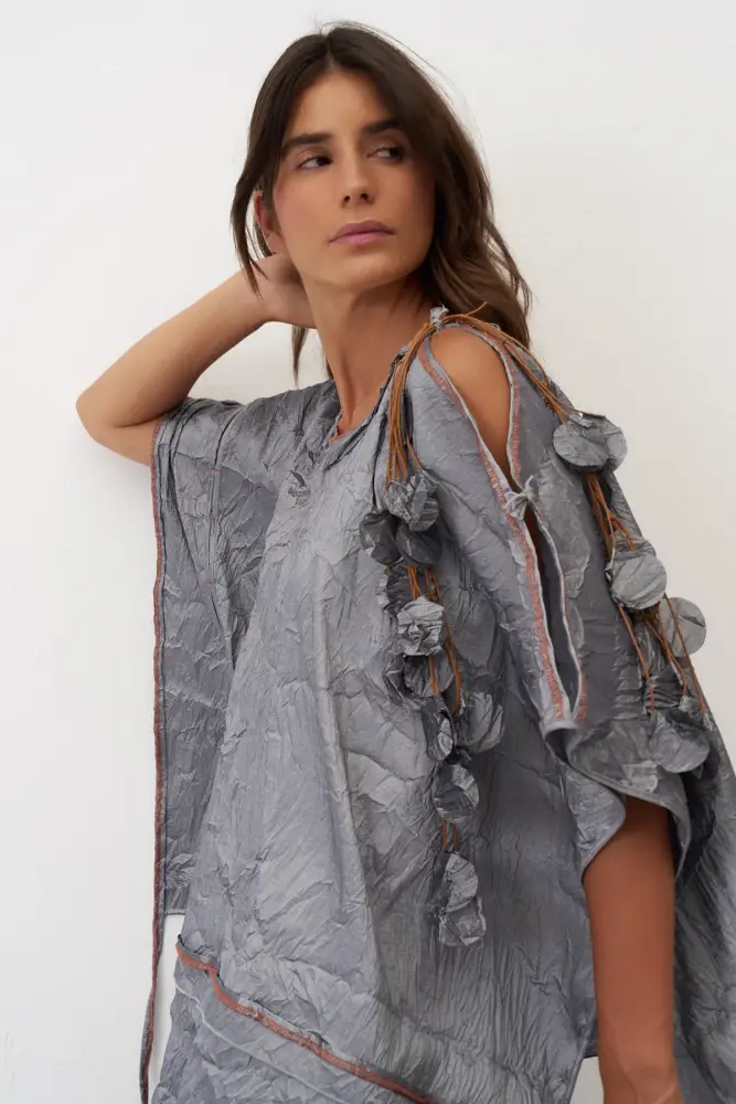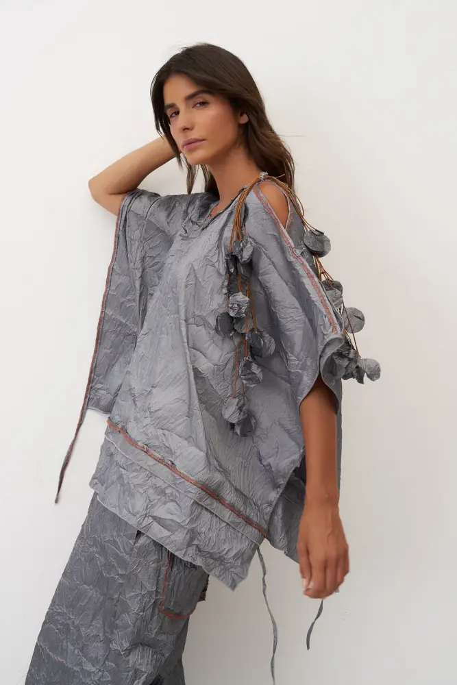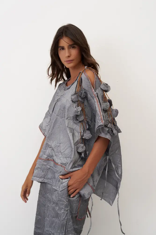 Omuzu Kolyeli Kırışık Vido Bluz - Gri