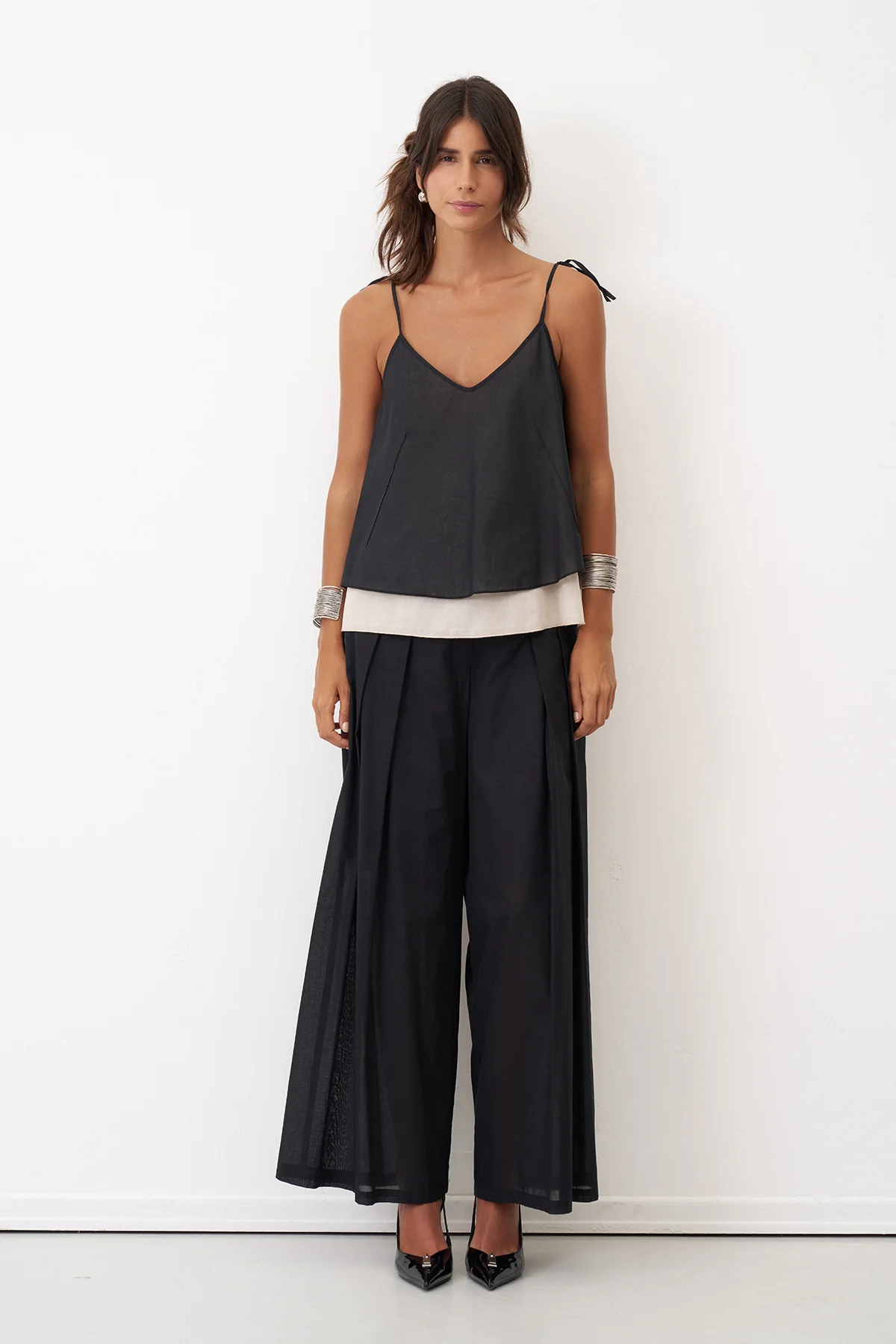 Siyah Bej İnce Askılı Etek Ucu Renkli Kambi Bluz
