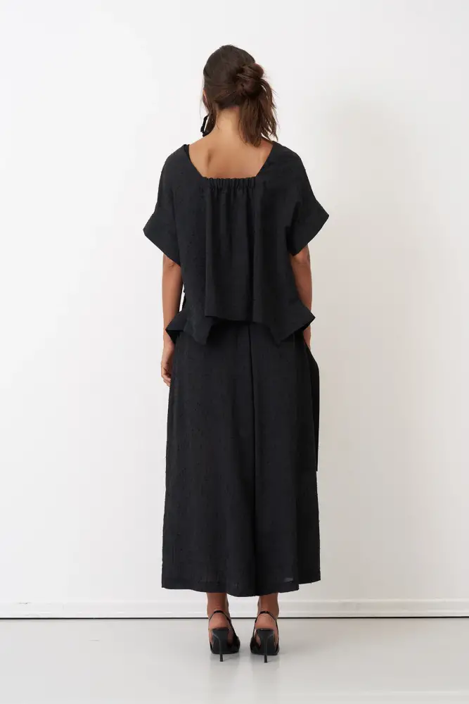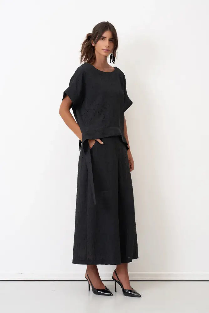 Siyah Dokulu Kumaş Kısa Paça Venetiko Bol Pantolon