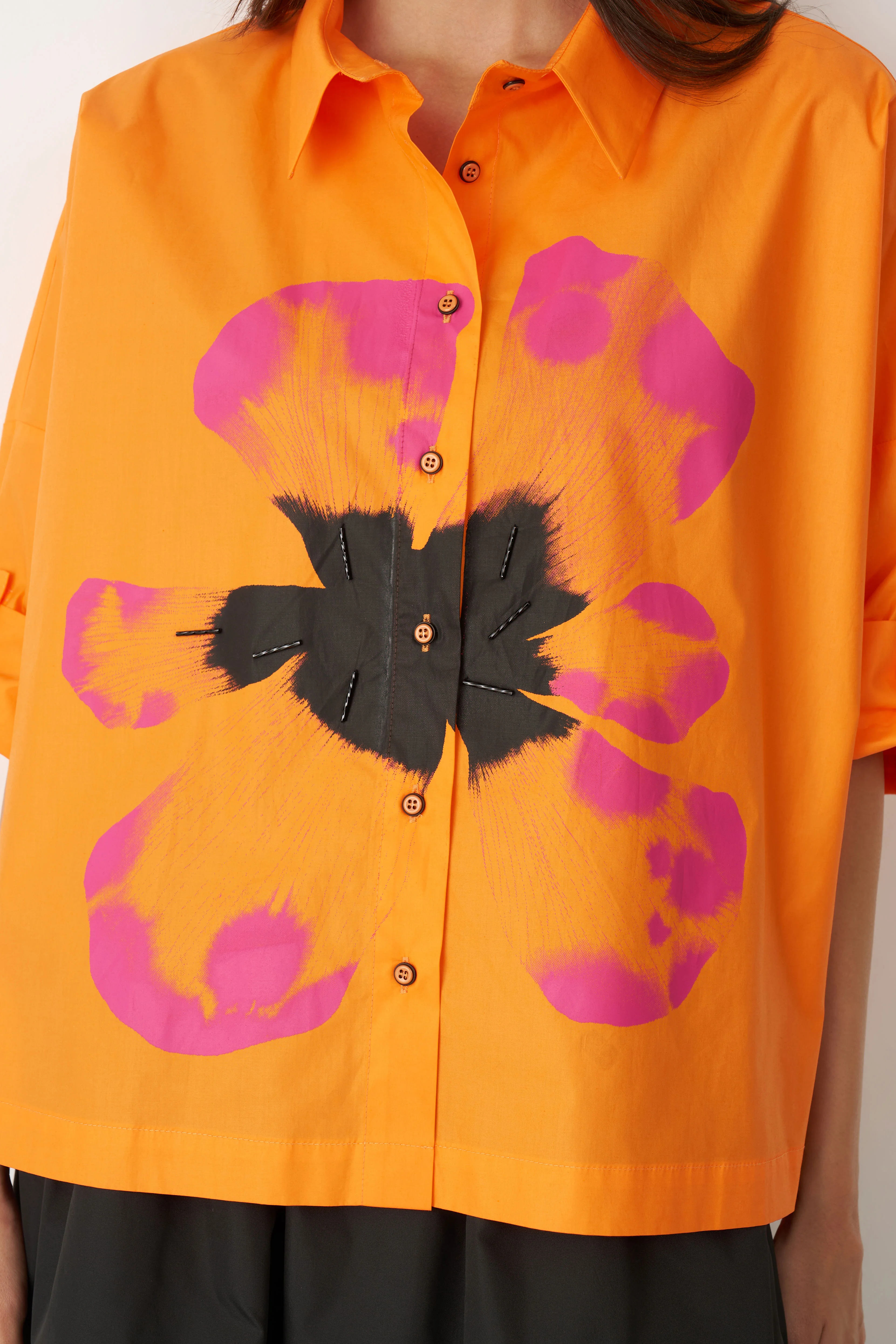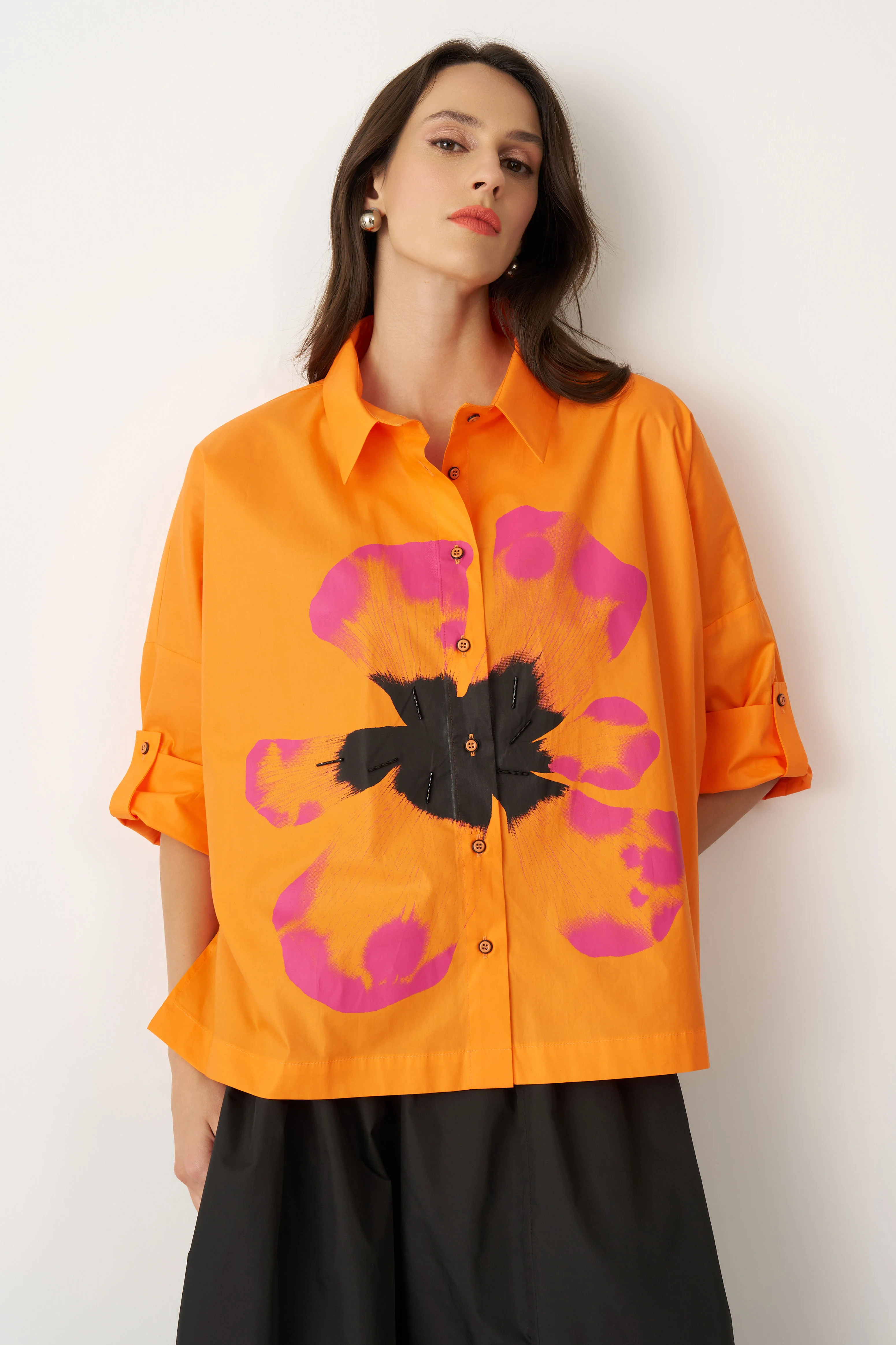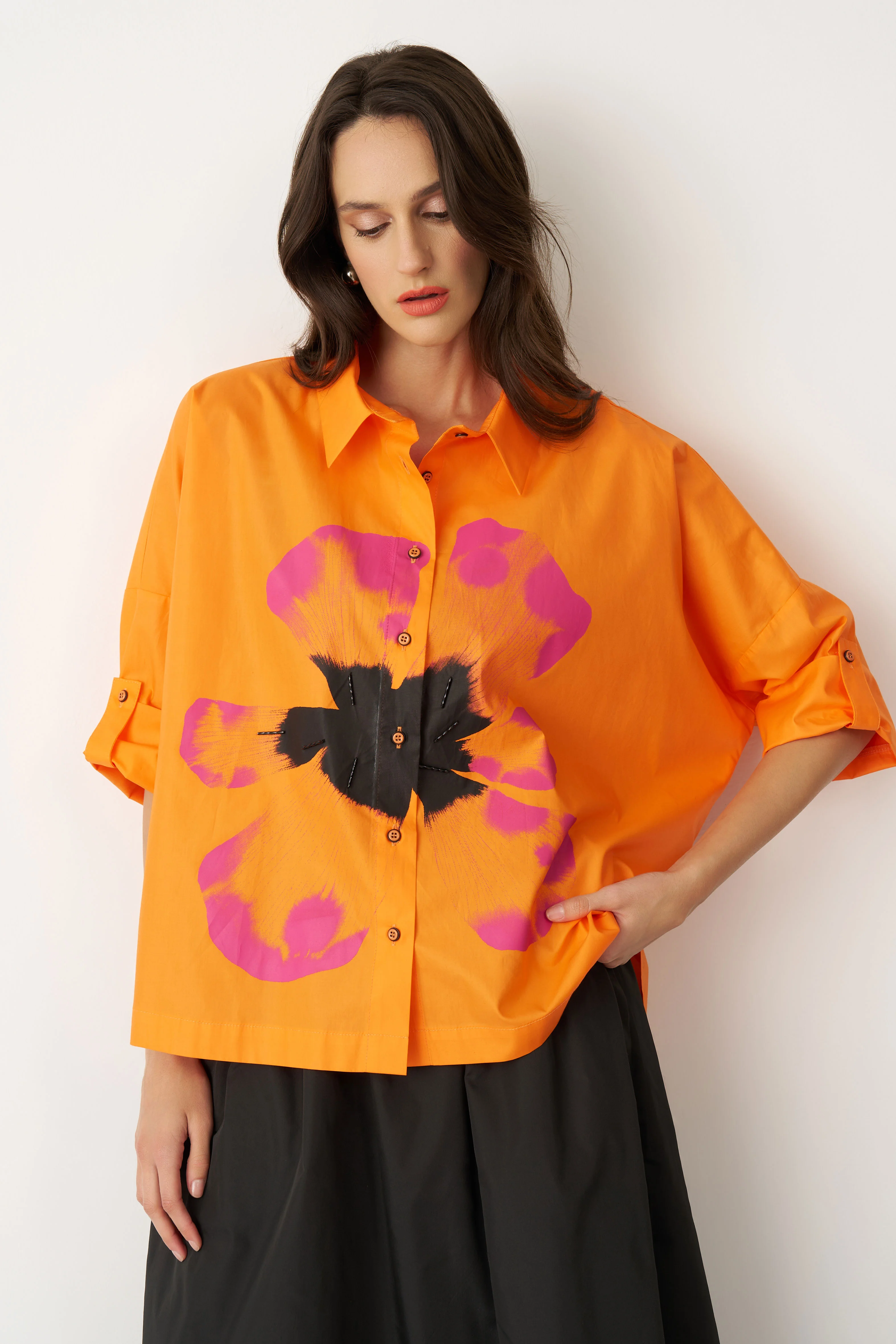Turuncu Önü Büyük Çiçek Baskılı Gavdos Gömlek