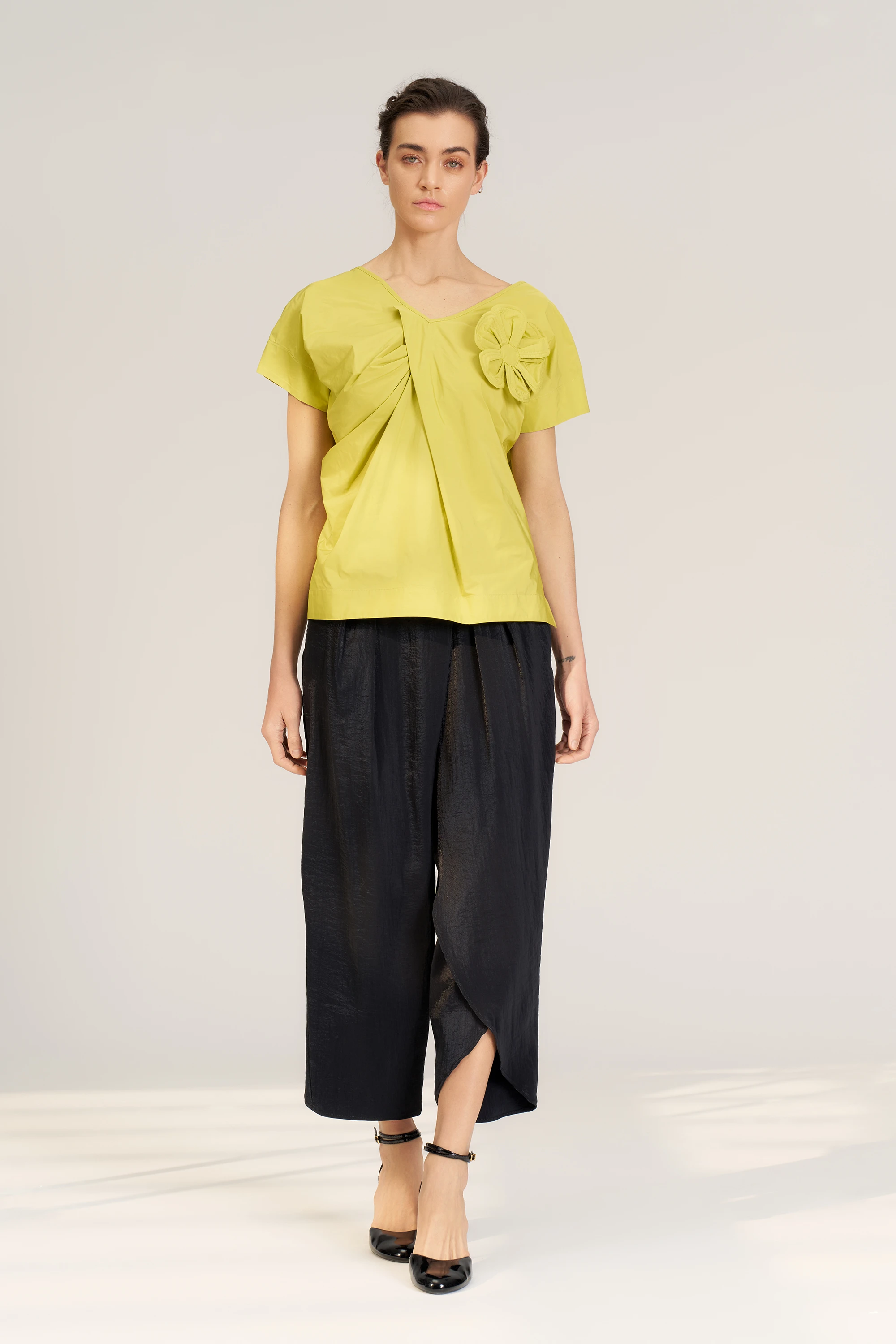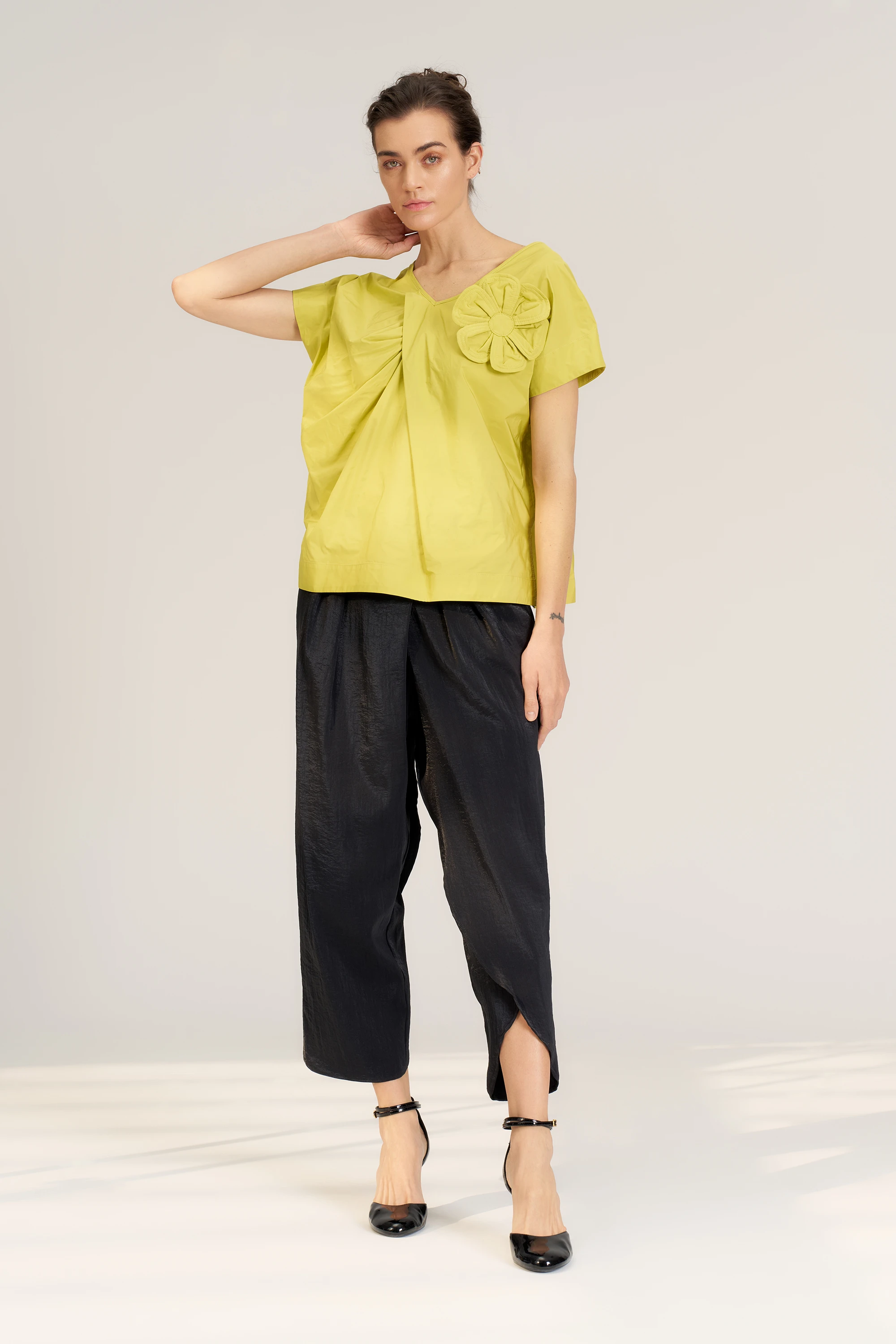 Yakası Çiçek Süslü Bluz - Lime