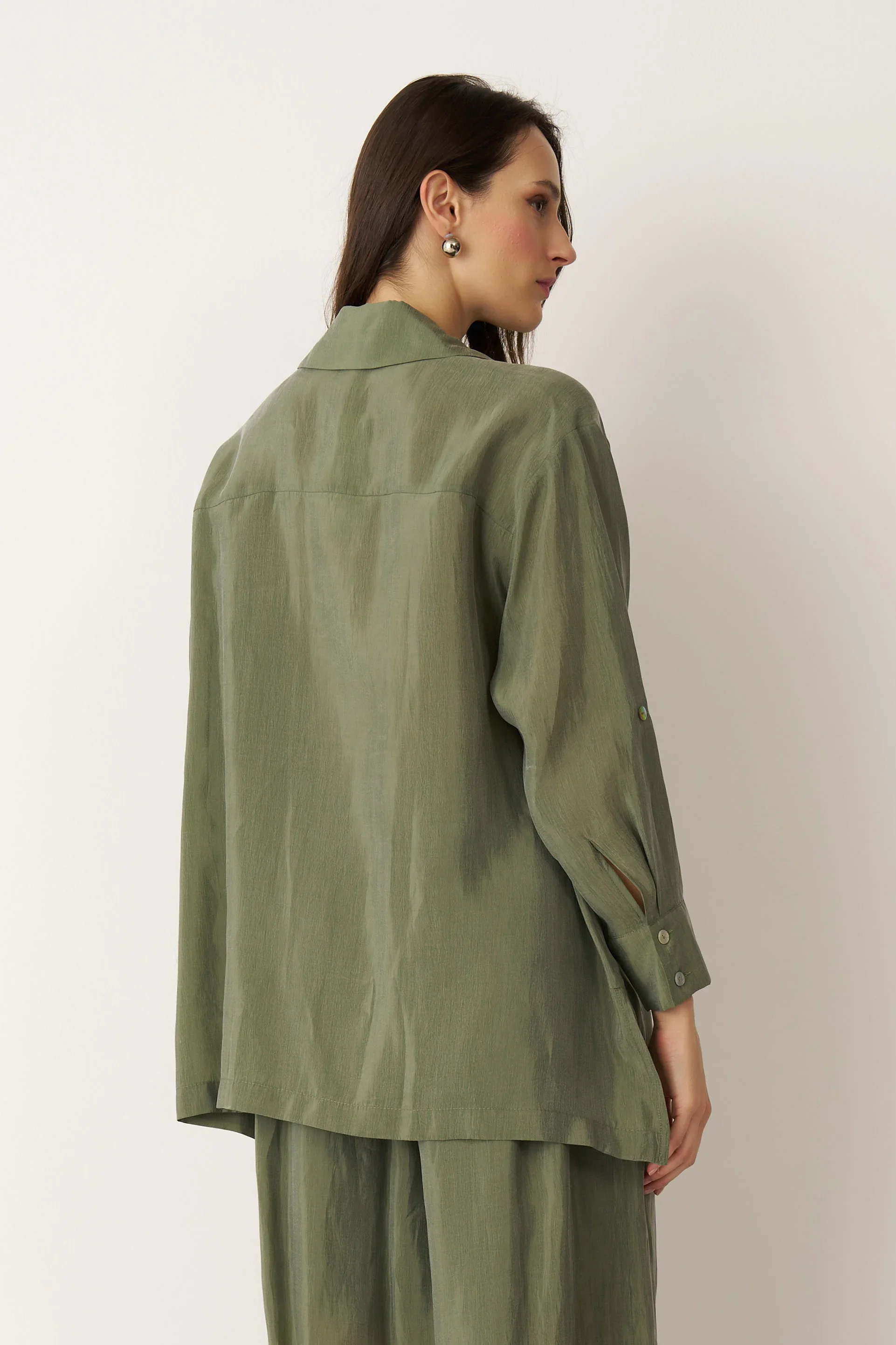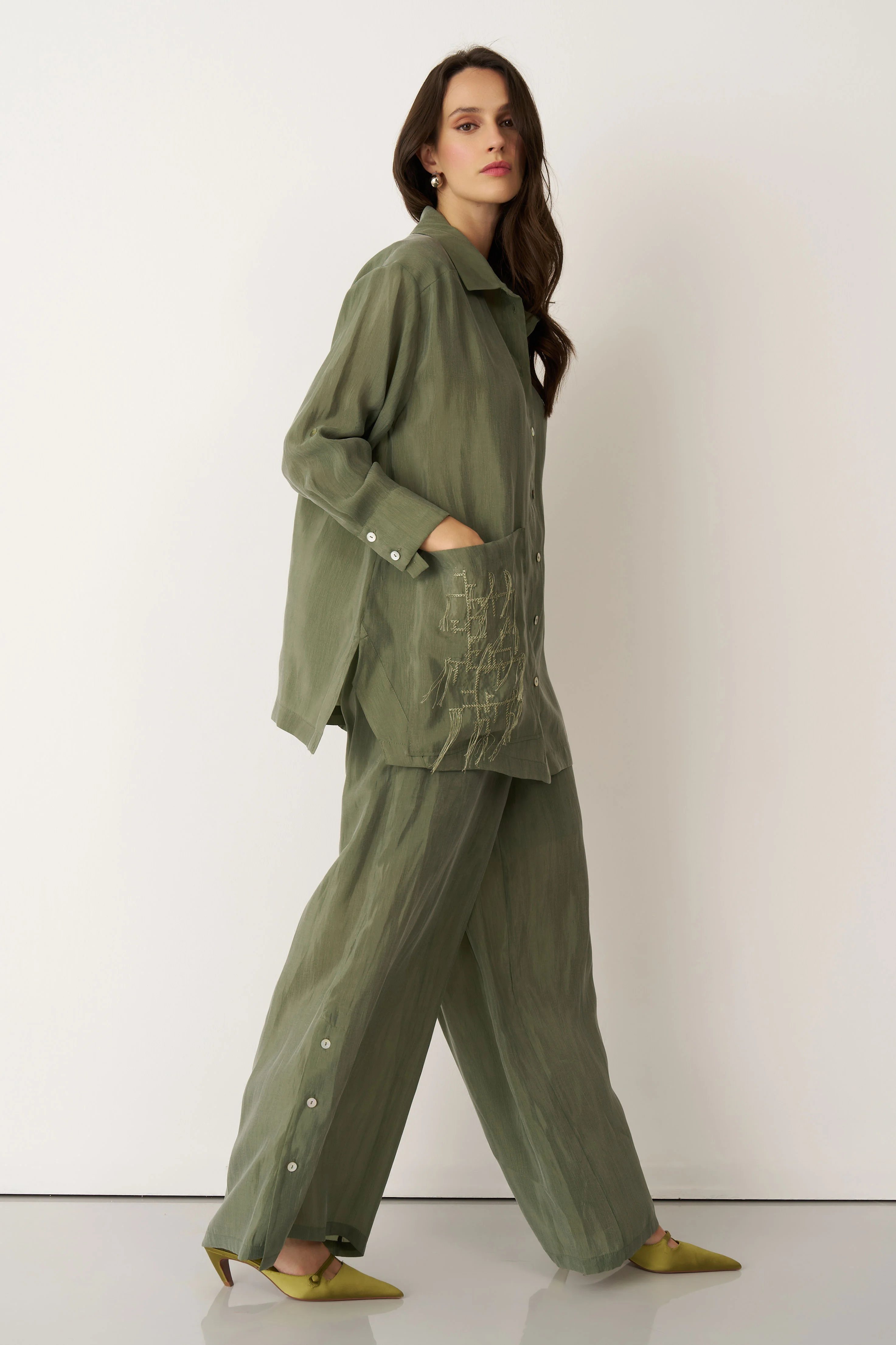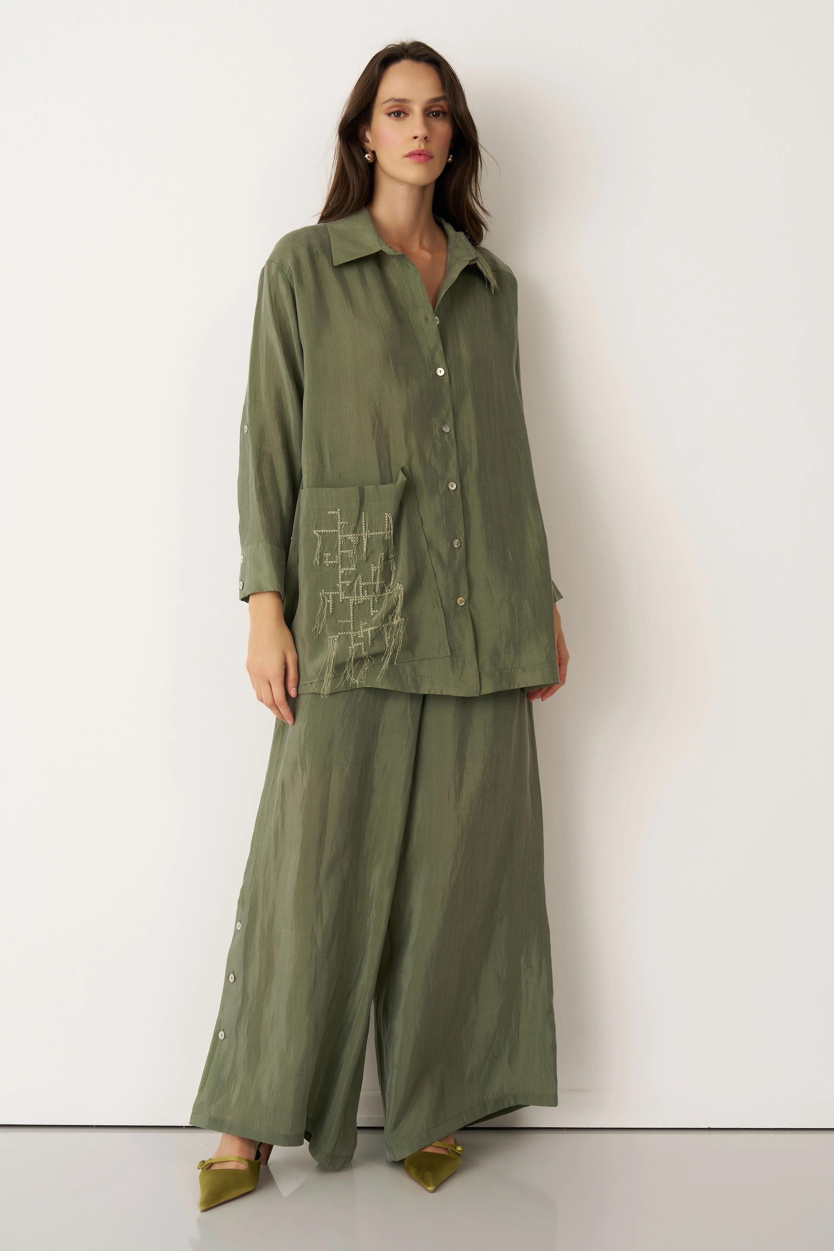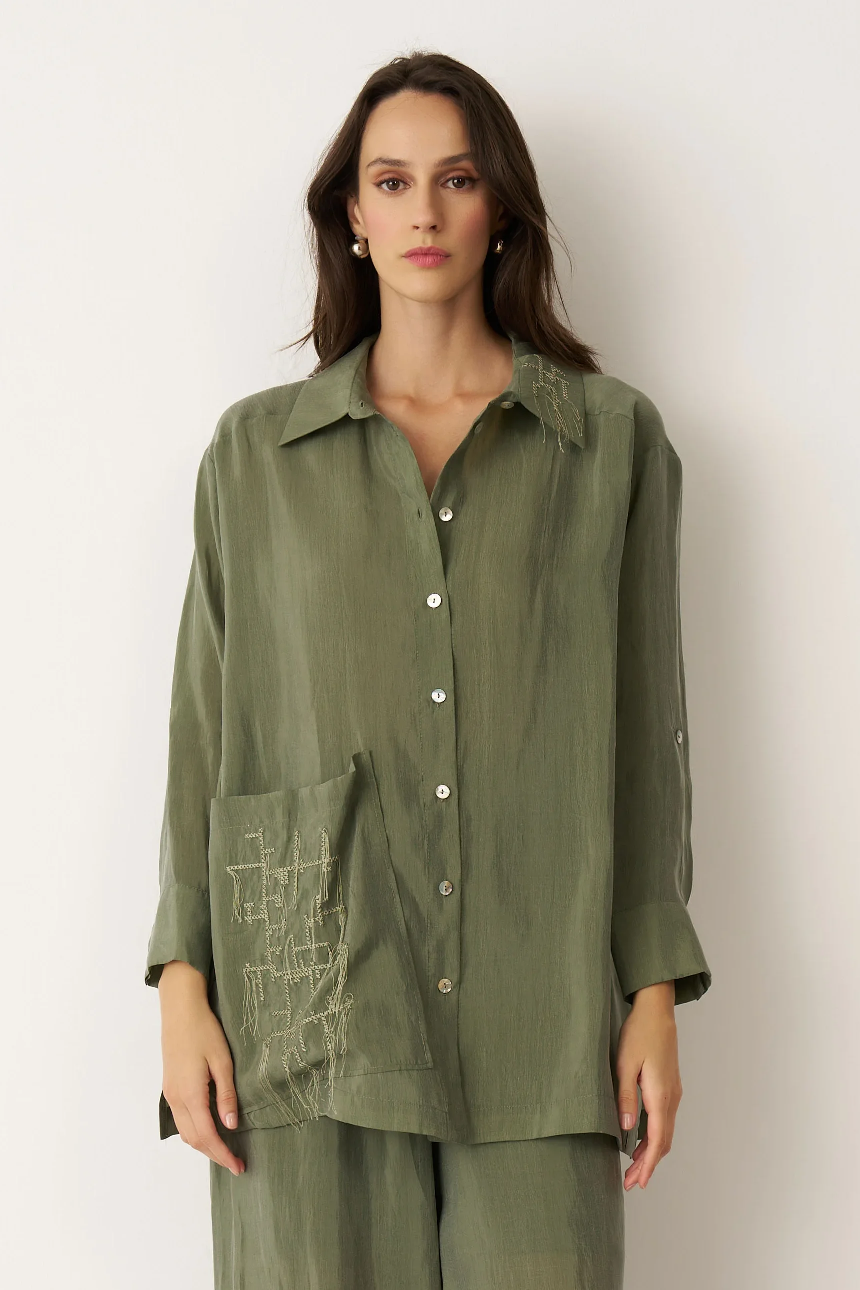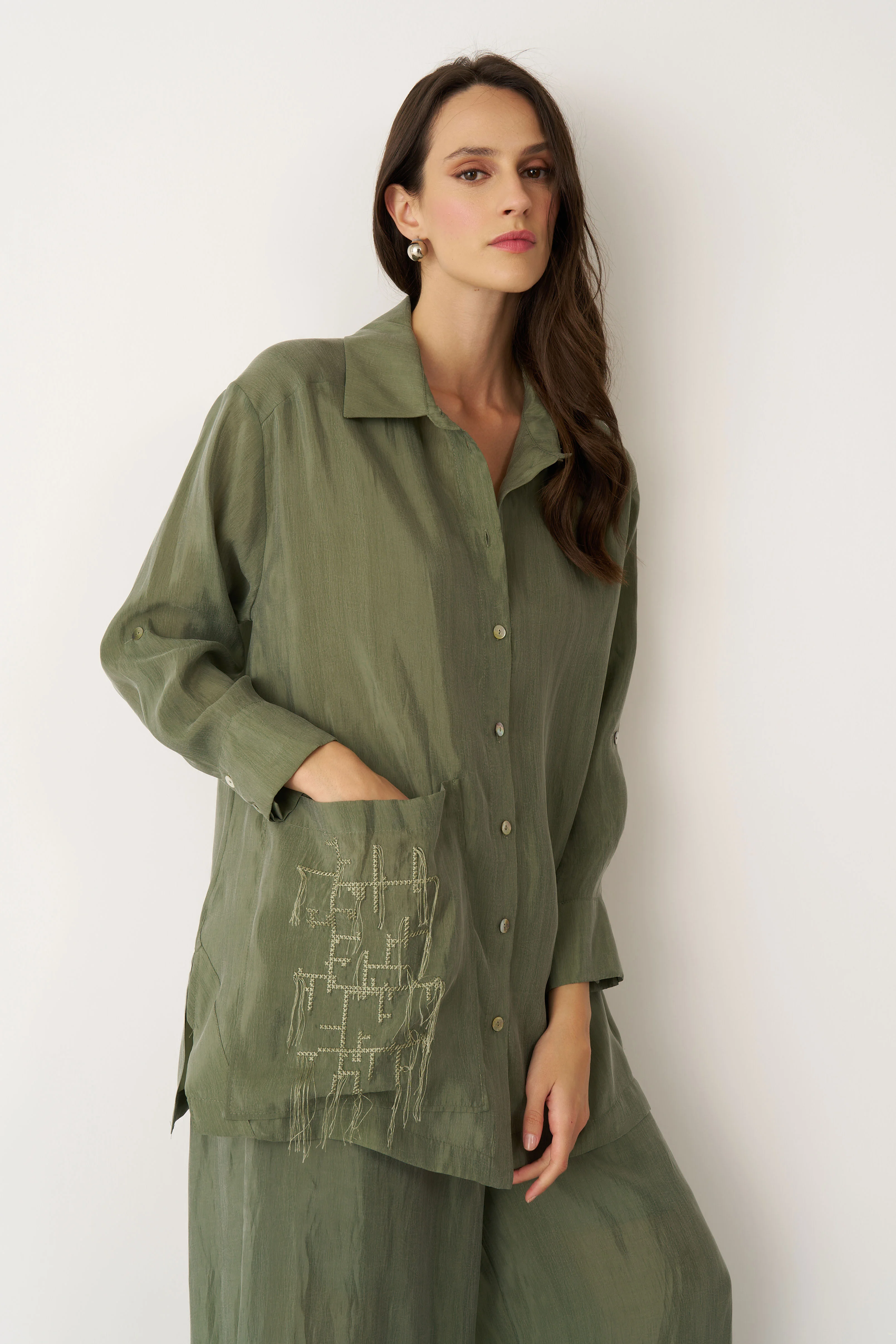 Yeşil Nakış Detaylı Büyük Cepli Mykonos Gömlek